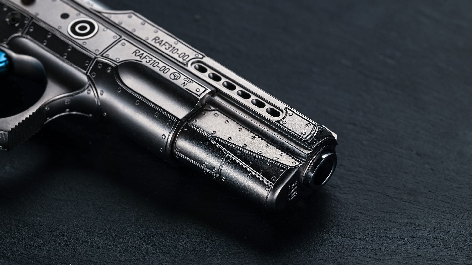 The surface of the pistol resembles the riveted body panels on the fighter plane. The extraordinary look this provides to the gun is further complemented by Rainbow Blue controls.