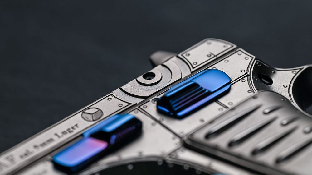 Under this decoration, you will find a key to the aluminum case that holds the pistol. Its shape is inspired by the unmistakable silhouette of the wings of a Supermarine Spitfire fighter plane.