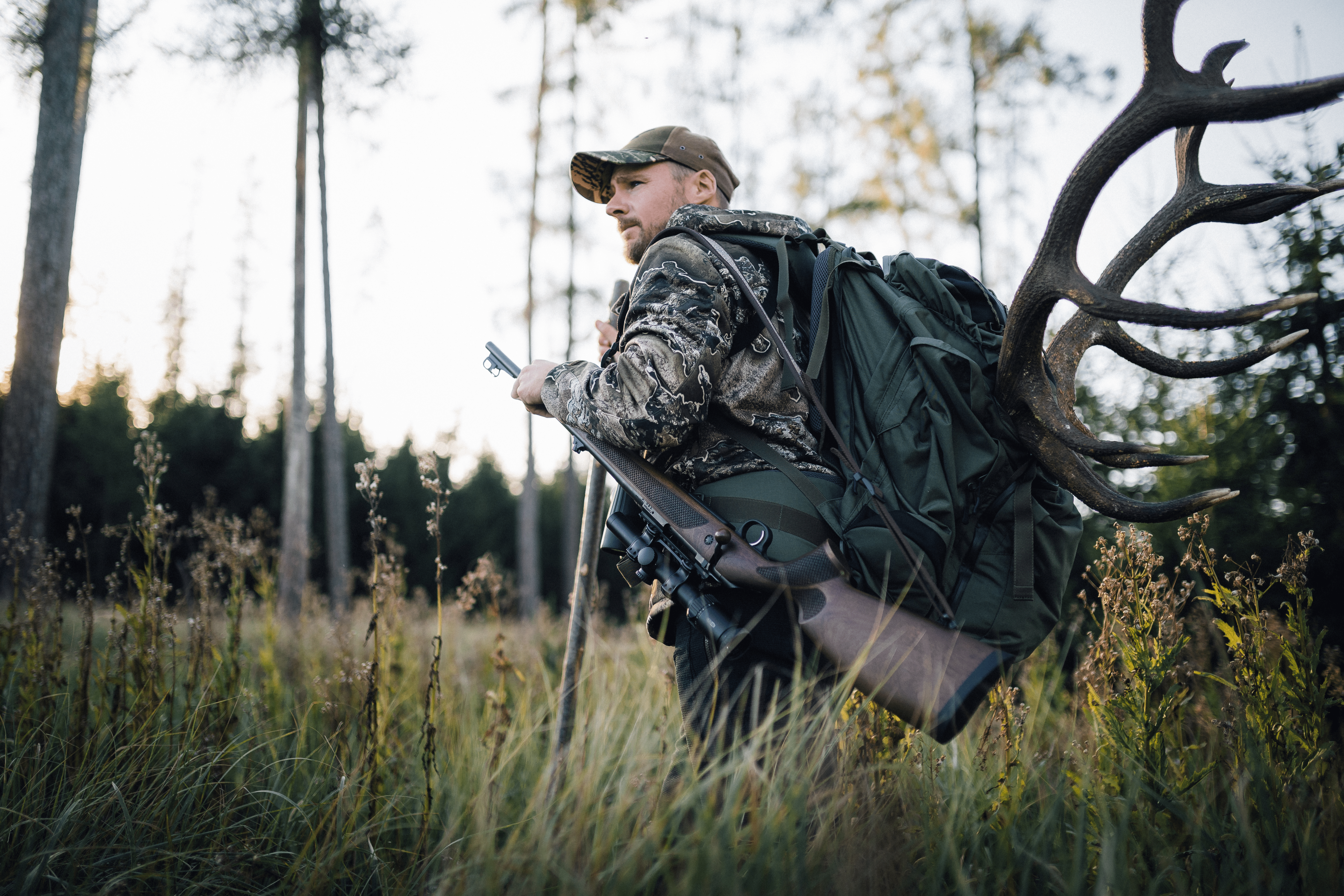 The stock, with its traditional European design, is made from select walnut and features a cheek piece on the left side, with a decorative forend made of dark brown laminated wood. The checkered grip ensures comfortable and reliable handling.