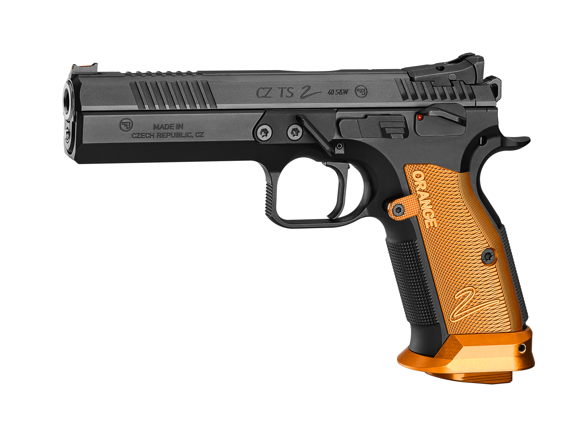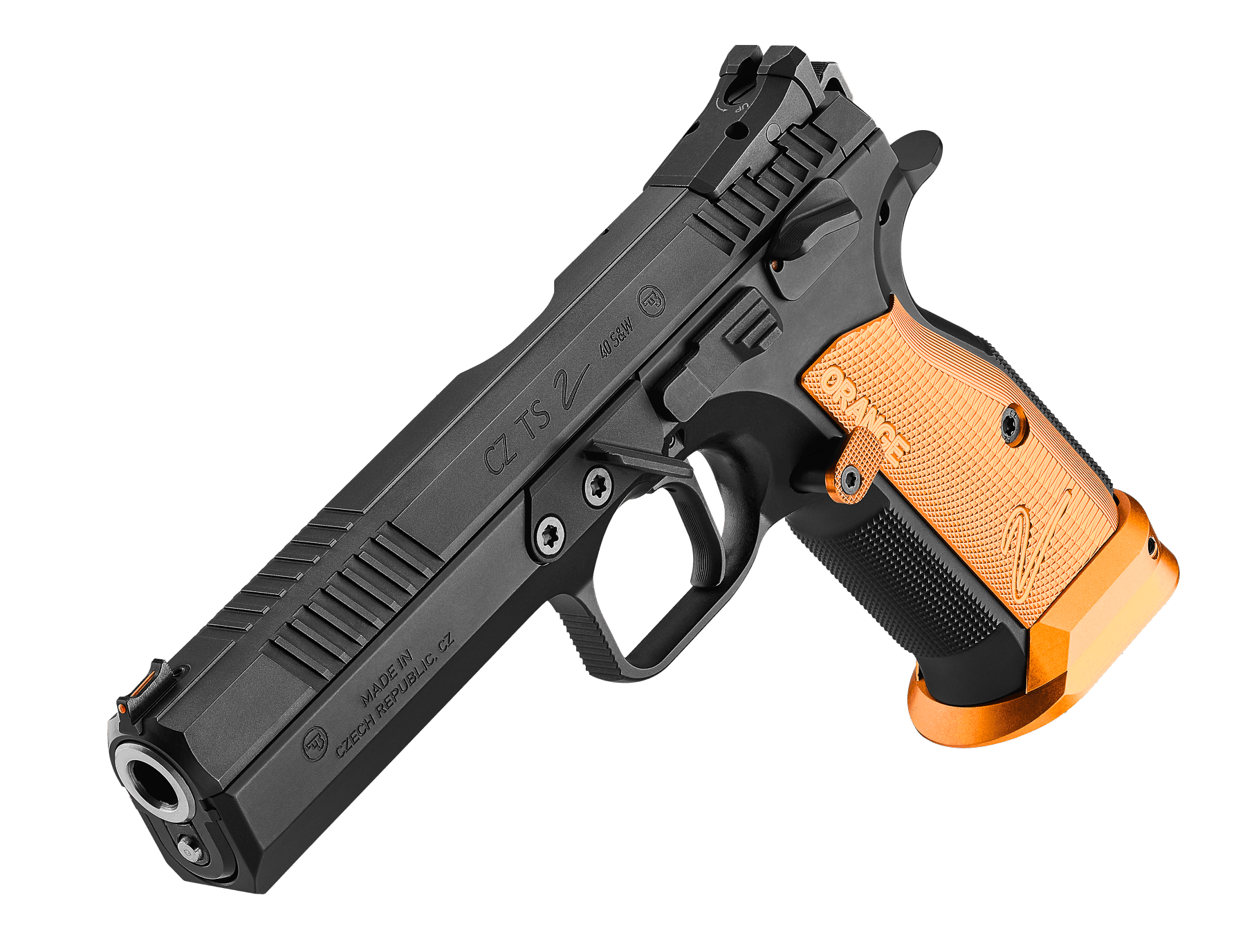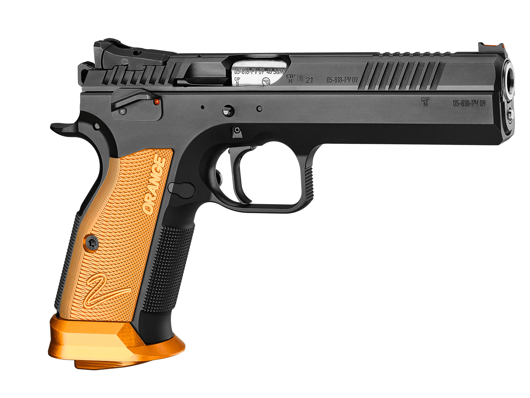 The barrel-to-slide and slide-to-frame are hand-fitted to achieve the smallest possible tolerances for optimized operation. This model also comes with a thin profile thumb rest with ideal placement, higher positioned ambidextrous manual safeties, and an adjustable rear sight. The duralumin grips, adjustable magazine release button, magwell, and magazine base plate are made from orange anodized duralumin.