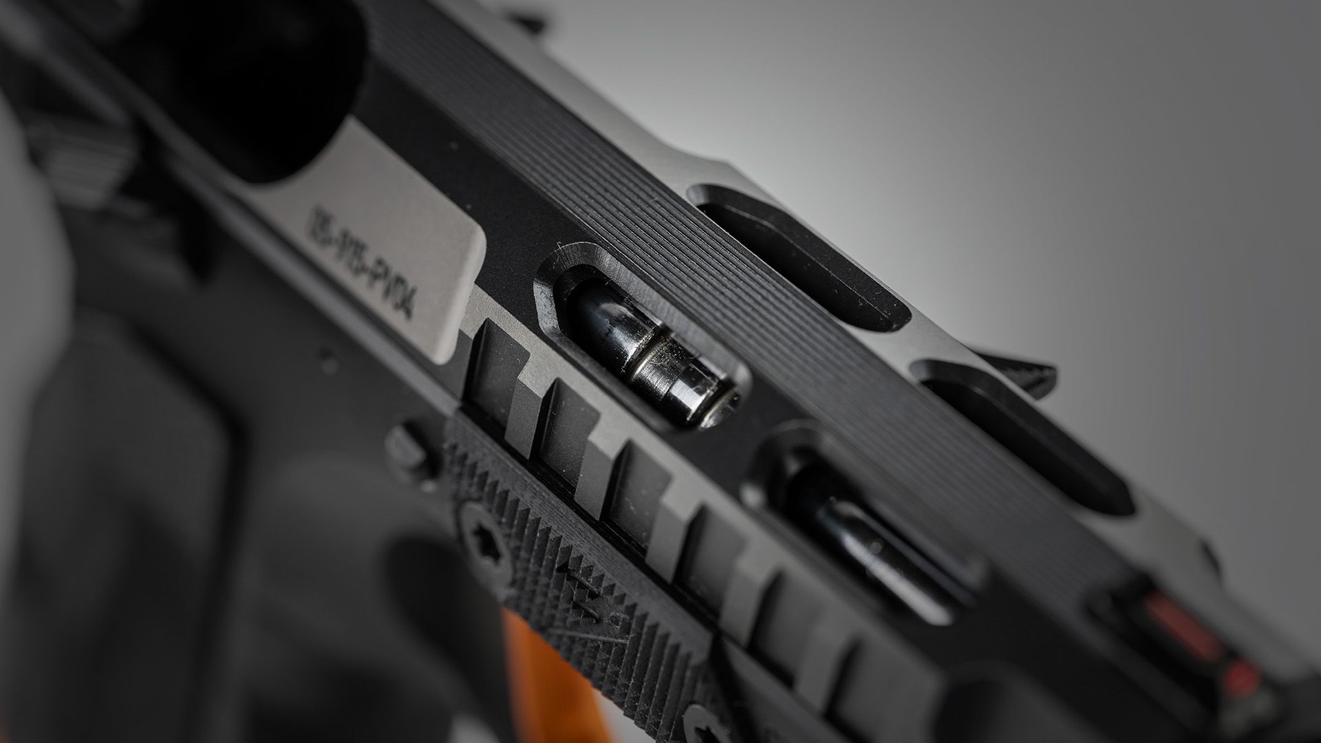The redesigned slide on the CZ TS 3 ORANGE features aggressive cocking serrations and optimized weight-relief cuts that increase handling comfort and underscore the modern character of the new generation of CZ sport pistols.