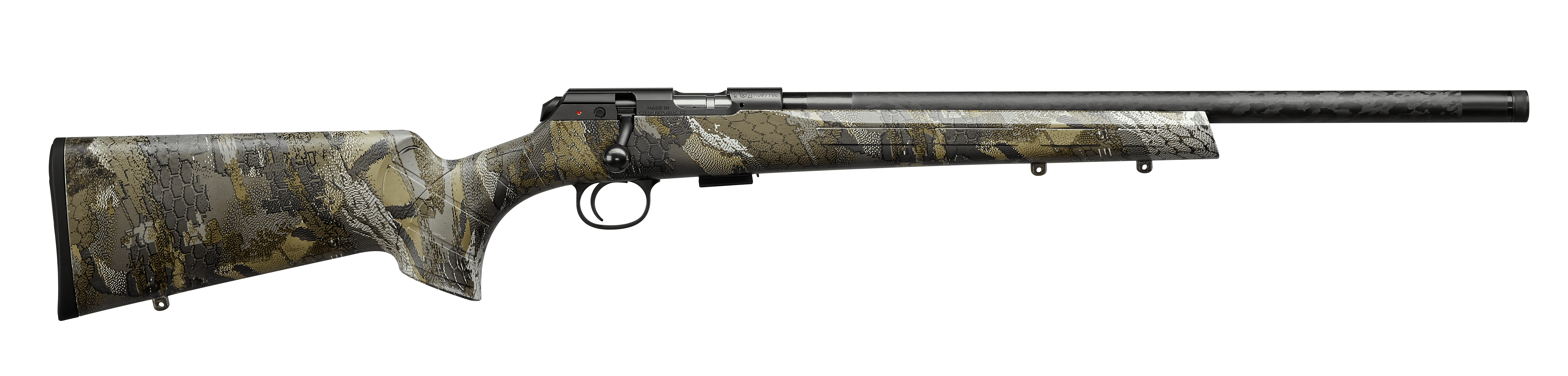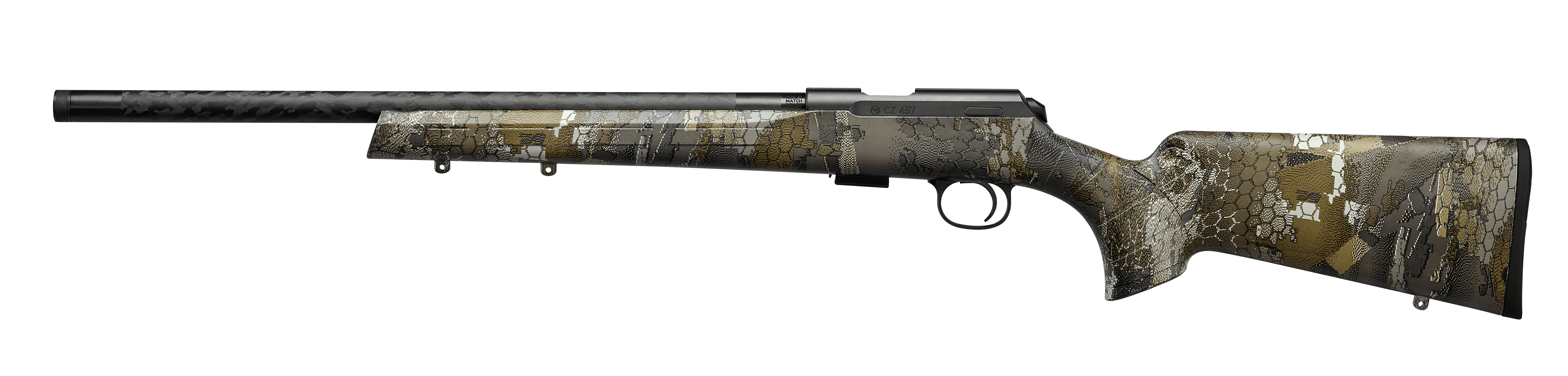 User-swappable barrels and calibersThe new, key feature of the CZ 457 CARBON, chambered in 22 LR, is an innovative composite barrel that combines the best properties of steel and carbon fiber to provide many unique advantages. Due to this advanced technology, the CZ 457 CARBON weighs in at only 2.15 kg, making it the lightest model in the CZ 457 series. It delivers the accuracy of varmint models, together with a host of new benefits.