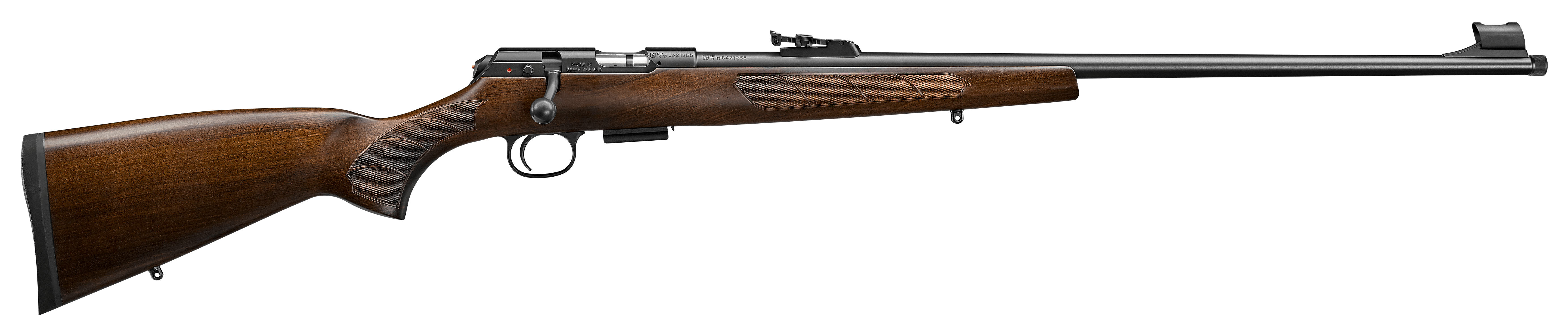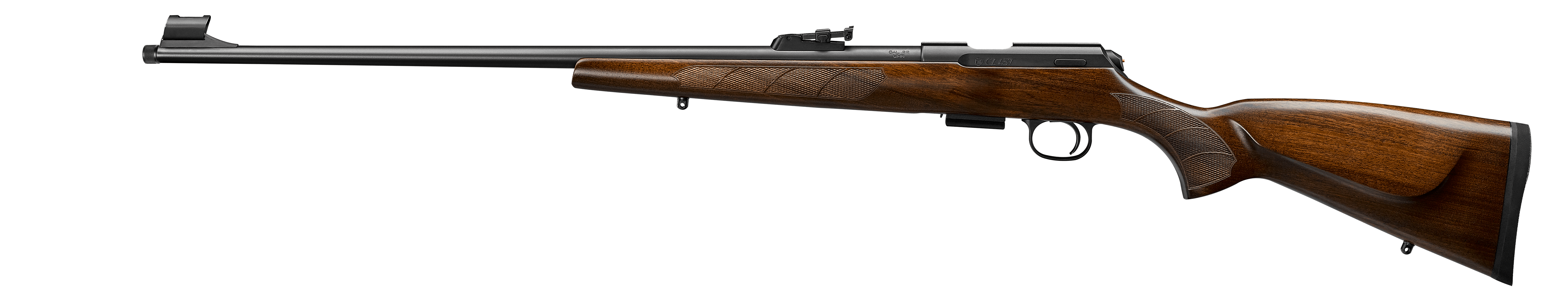 User-swappable barrels and calibersAn accurate, safe, reliable, and modern rimfire rifle with a classic European centerfire hunting rifle design. The varnished stock with cheekpiece is made of high-quality Turkish walnut and features laser-etched checkering on the grip. Traditional iron sights come as standard.