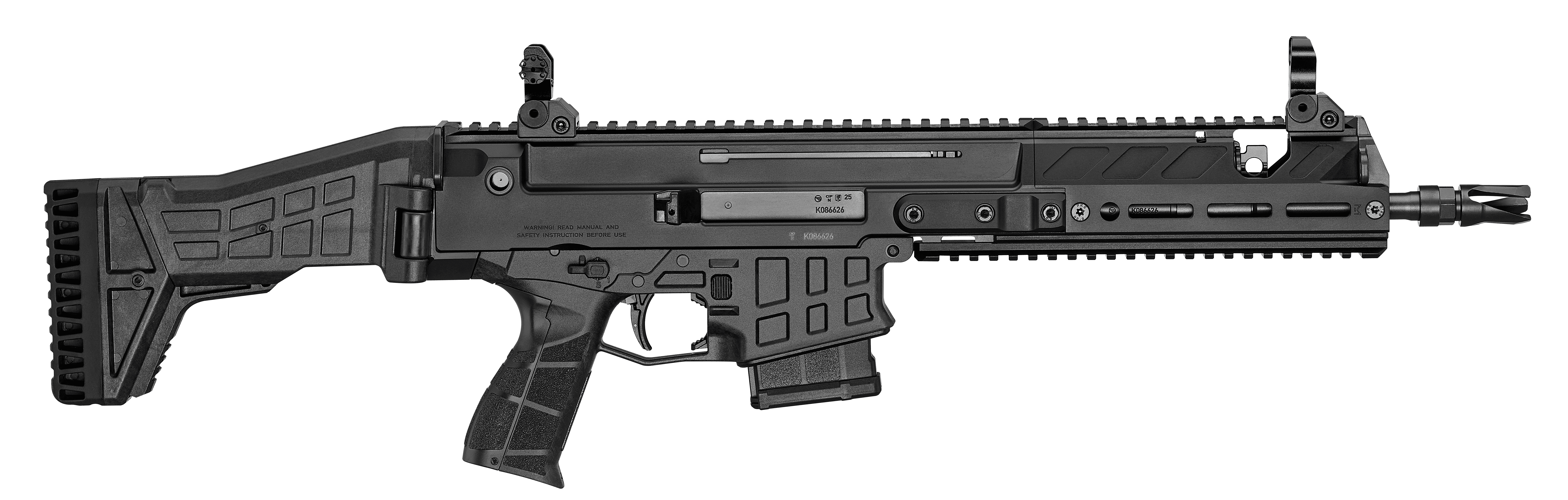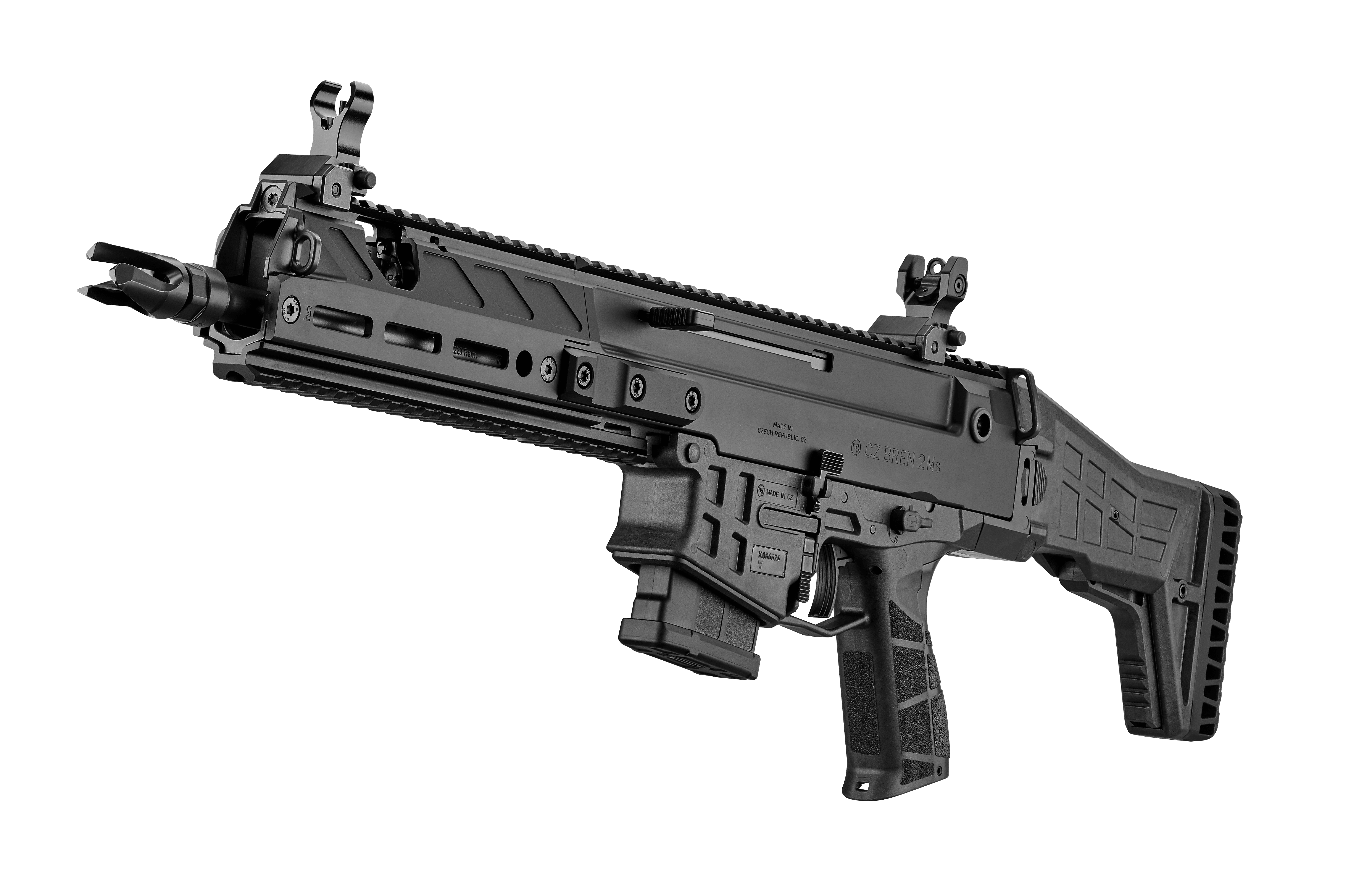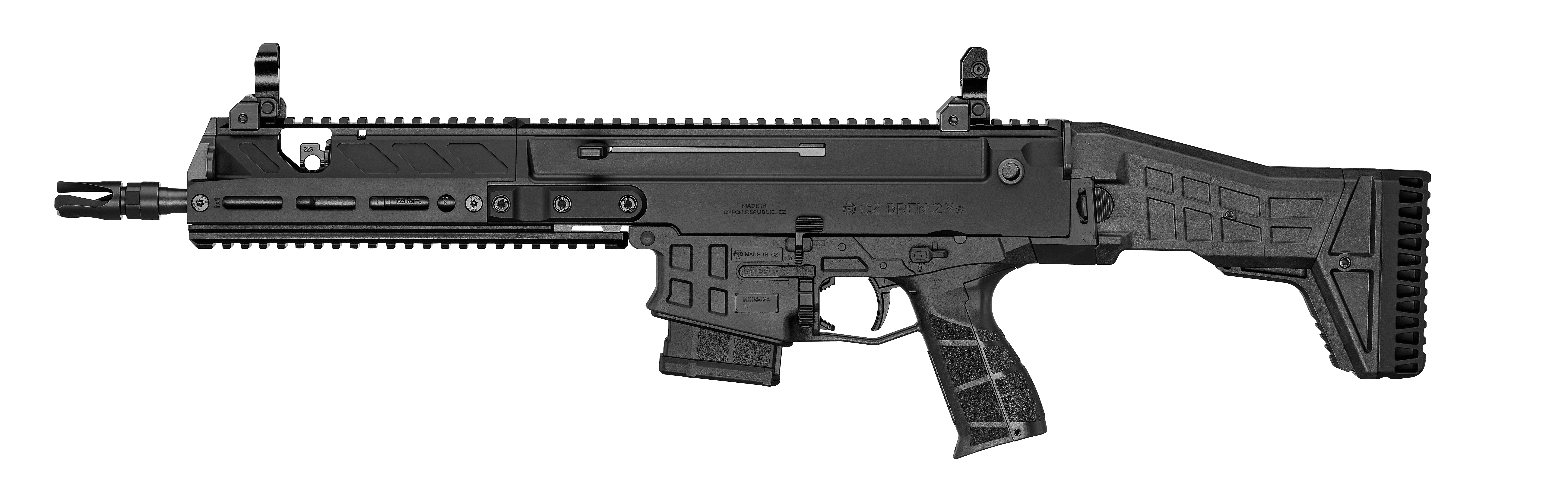 Receiver made from lightweight 7075 aircraft-grade aluminum alloyThe semi-automatic CZ BREN 2 Ms rifle is chambered in the popular 223 Rem. caliber. It features a short, interchangeable forend and 280 mm barrel. Despite its compact dimensions, it's a highly accurate firearm. Standard equipment includes mechanical sights.