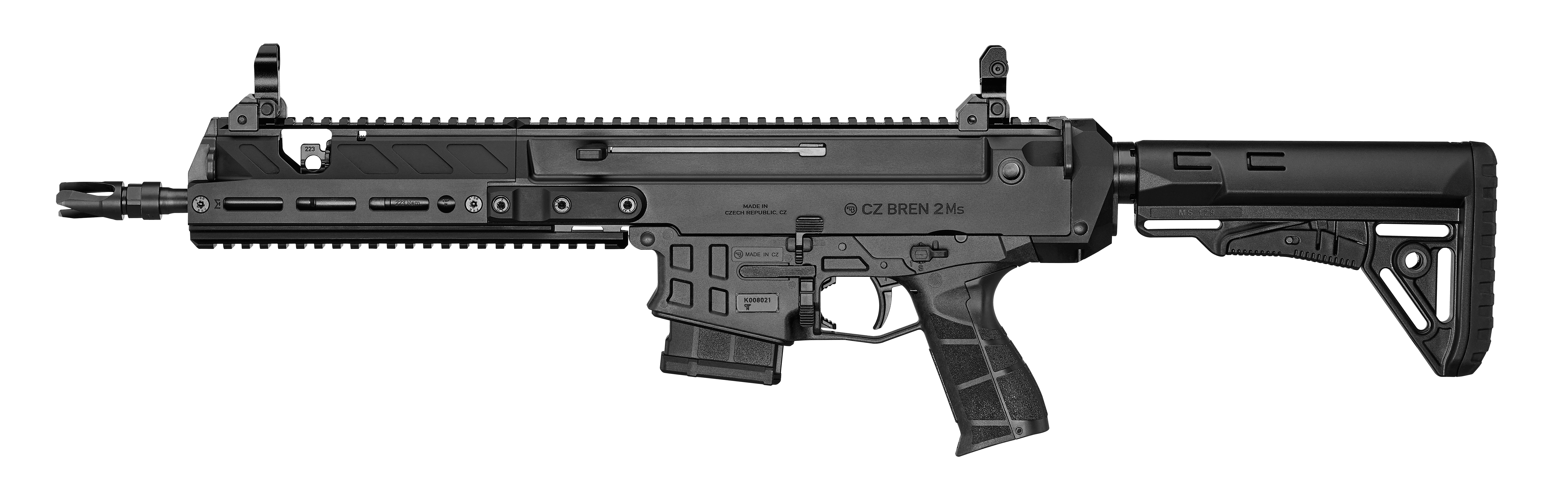The CZ BREN 2 Ms semi-automatic carbine is chambered in the popular 223 Rem. caliber. It comes with a long, interchangeable forend, 425 mm barrel, and extended folding/telescopic shoulder stock with raised comb. Its design is optimized for accurate shooting, even at longer distances. Standard equipment includes mechanical sights.
