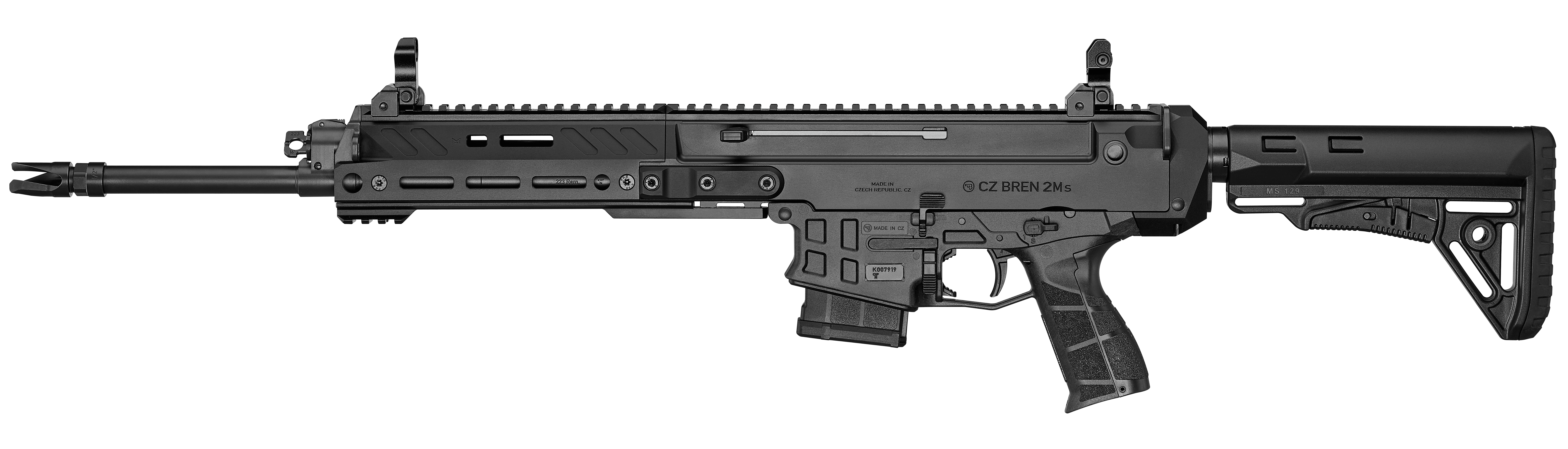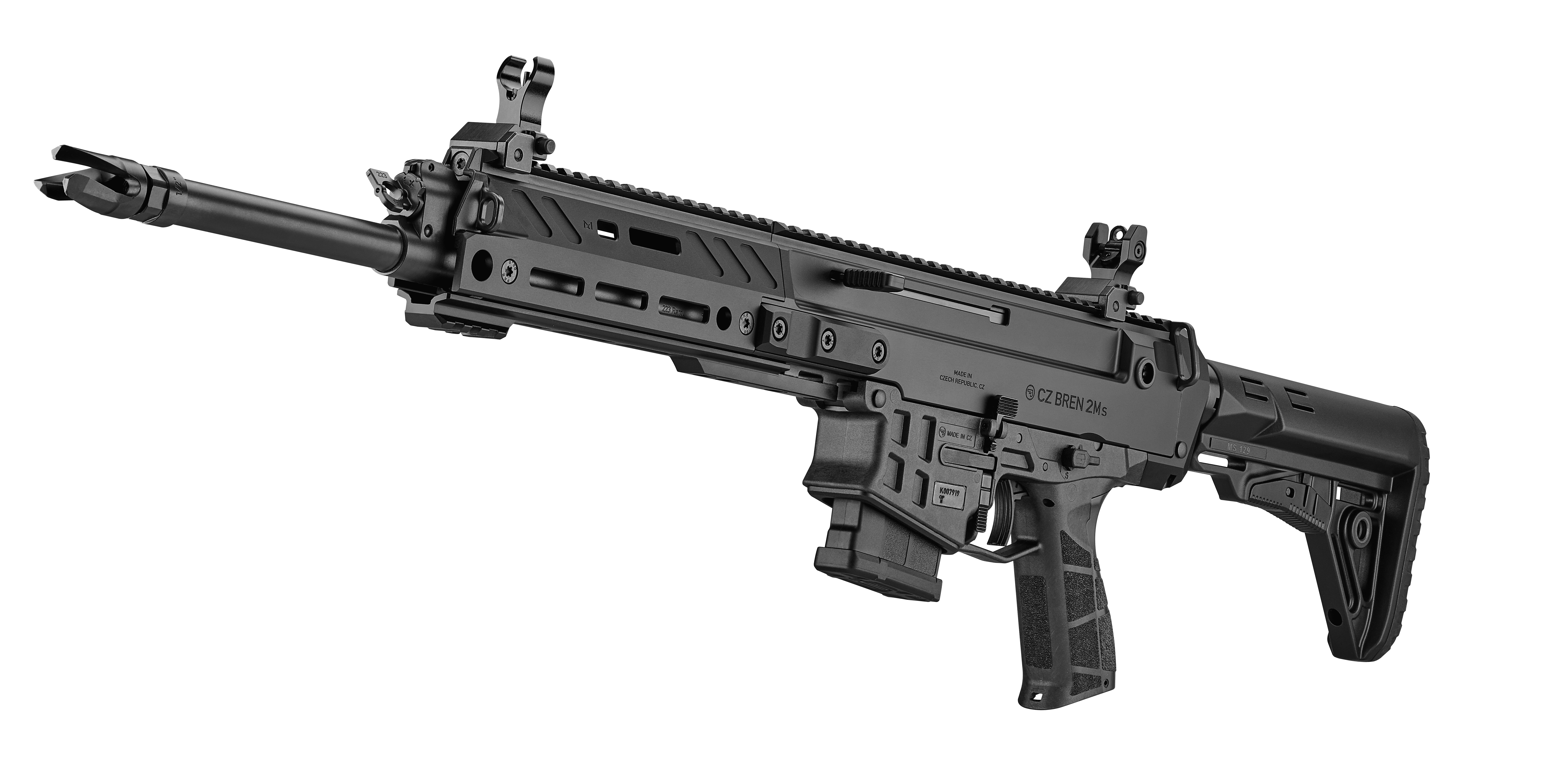 Receiver made from lightweight 7075 aircraft-grade aluminum alloyThe CZ BREN 2 Ms semi-automatic carbine is chambered in the popular 223 Rem. caliber. It comes with a long, interchangeable forend, 425 mm barrel, and extended folding/telescopic shoulder stock with raised comb. Its design is optimized for accurate shooting, even at longer distances. Standard equipment includes mechanical sights.